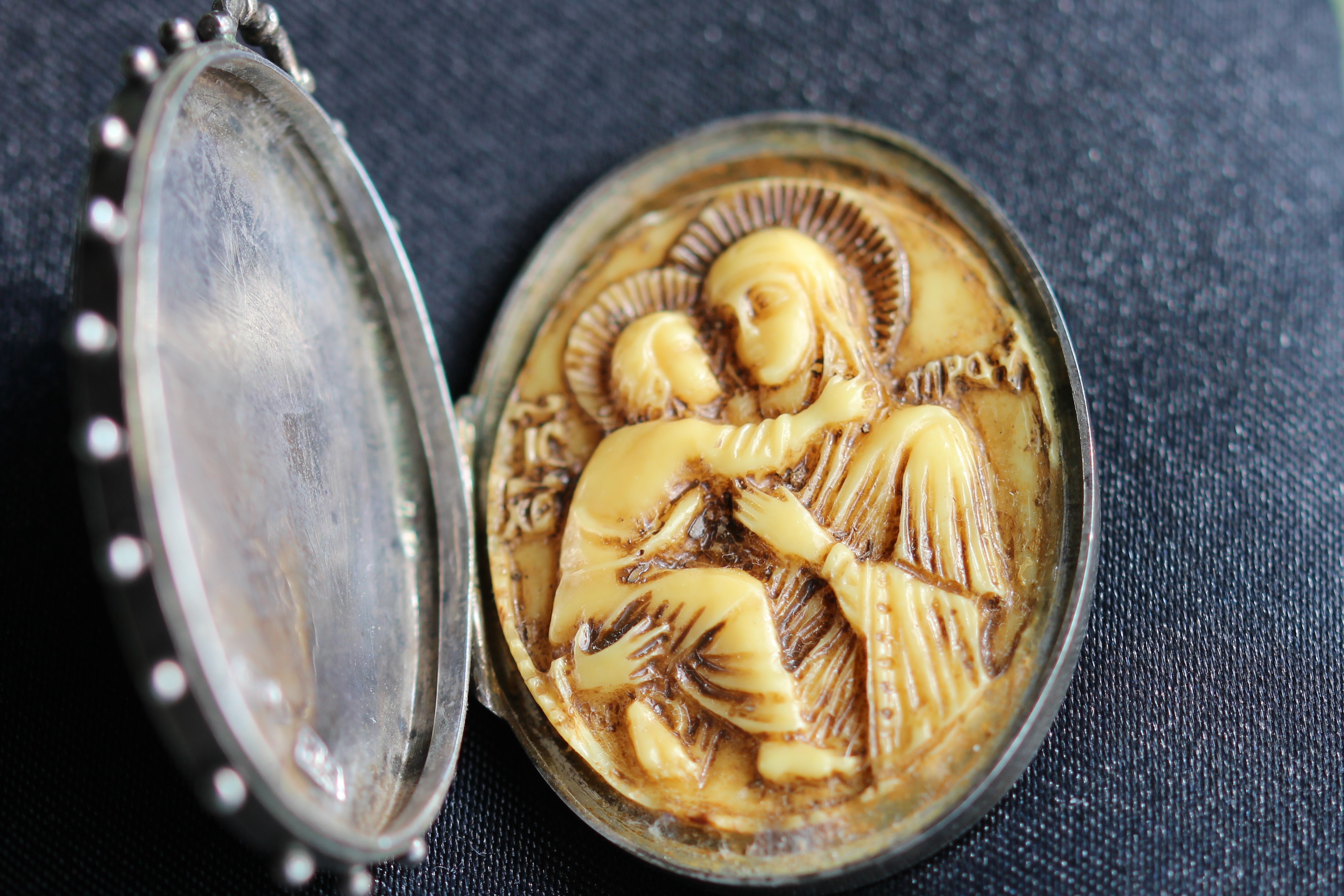 Antique Russian silver locket containing an ivory carved mother and child, 875/1000, circa1890