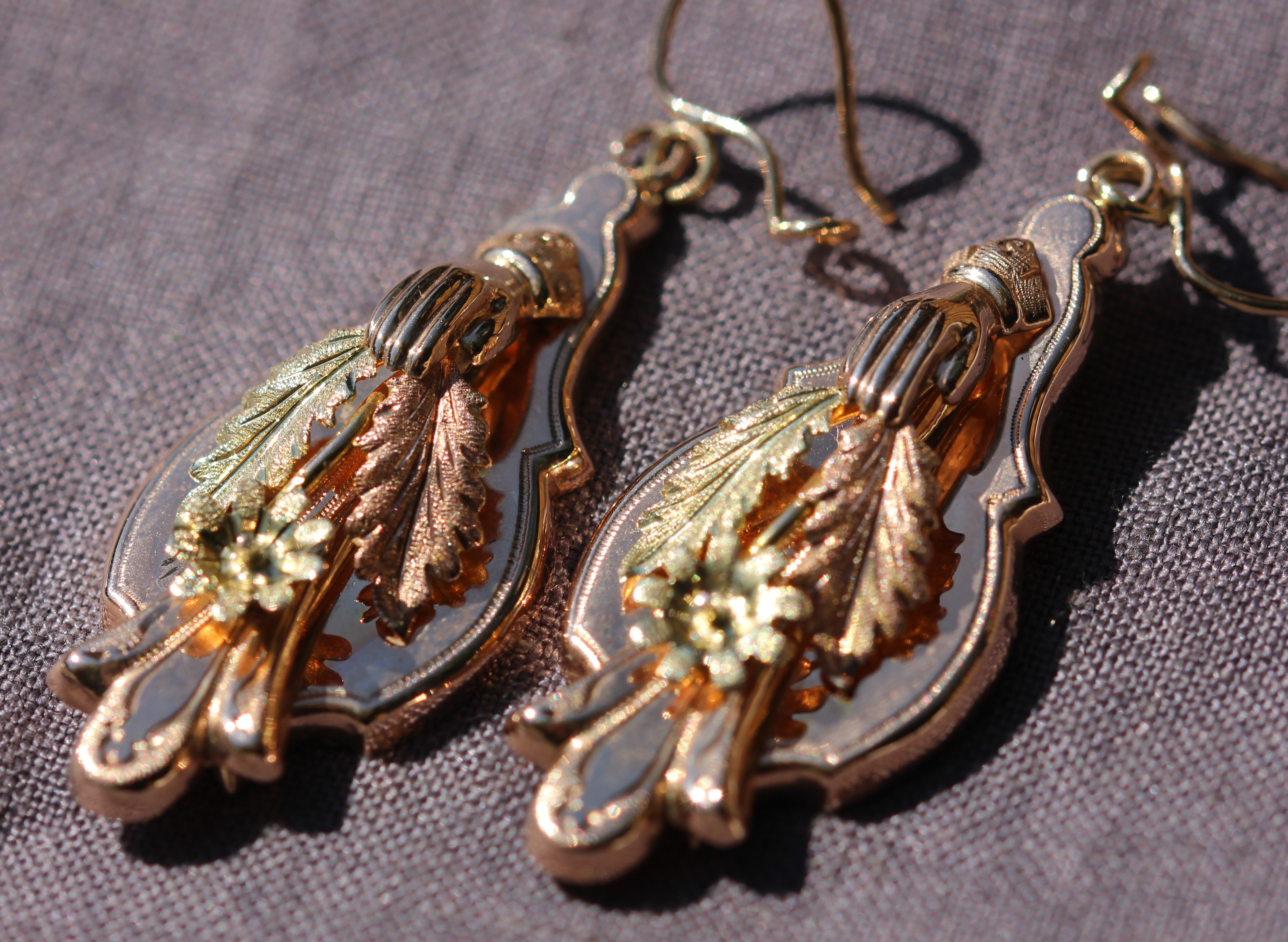 However, in the Victorian period, hands made of Whitby jet and other black materials and holding a wreath were used as mourning jewellery. Gold hands with cuffs, as in the earrings above, or carved from ivory, and holding flowers were probably given as a romantic gift.