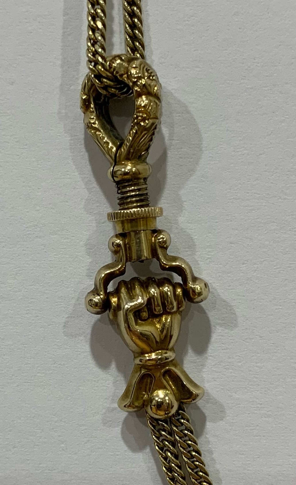 Hands as jewellery became very fashionable again in the late Georgian era, used as necklace clasps in the form of gloved hands. There was generally just a single hand, usually with cuffs, some made of lace, set with gemstones, or with a cuff bangle. The hand might be wearing a ring. The use of such clasps does not appear to have any specific symbolism but rather were just a lovely image.