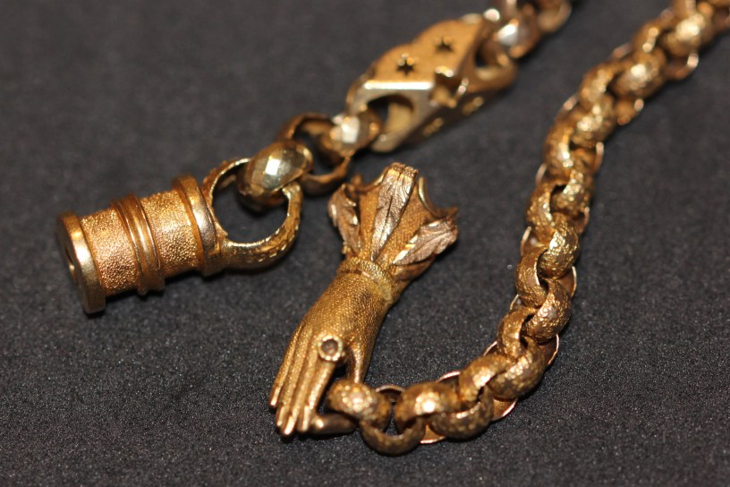Hands as jewellery became very fashionable again in the late Georgian era, used as necklace clasps in the form of gloved hands. There was generally just a single hand, usually with cuffs, some made of lace, set with gemstones, or with a cuff bangle. The hand might be wearing a ring. The use of such clasps does not appear to have any specific symbolism but rather were just a lovely image.