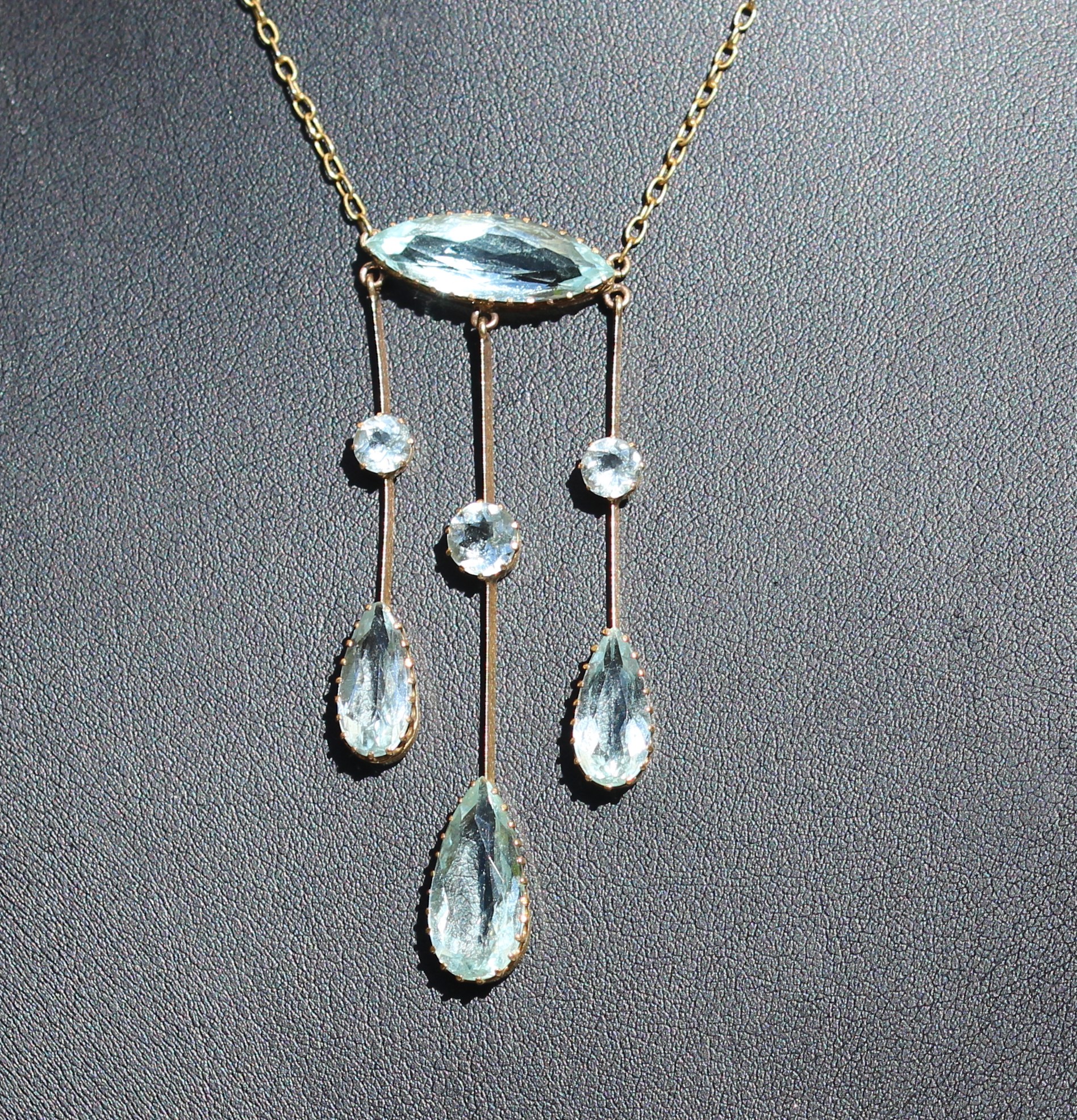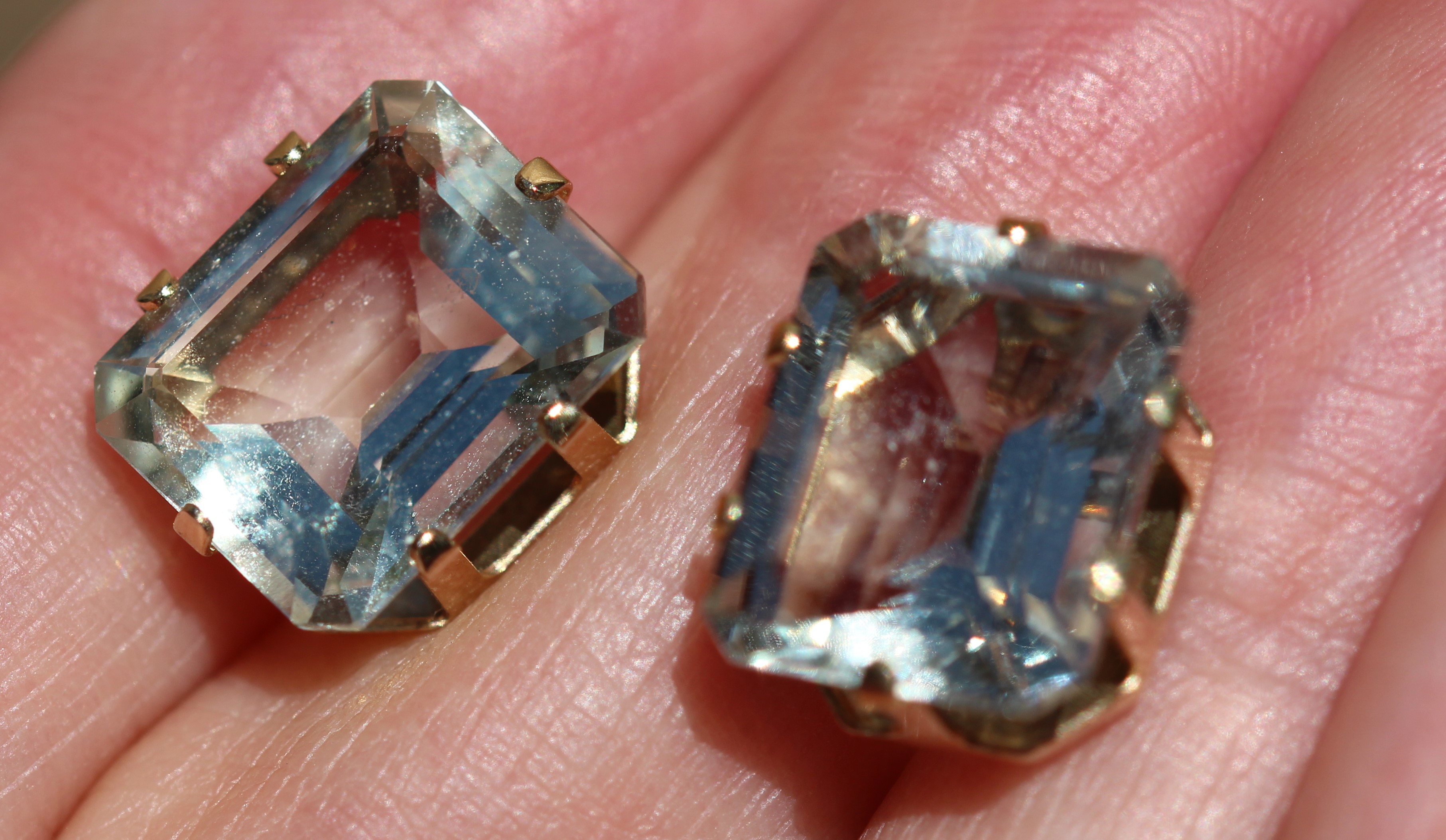 The large aquamarine earrings below are a very faint blue. Aquamarines are pleochroic, that is, they show different colors in different crystal directions. When we look at the earrings, depending on the direction, they are almost colourless and from another angle, they are a very light blue. If they were colourless from both directions, then they would be classed as a colourless beryl, called a goshenite, rather than an aquamarine. Goshenite are named after Goshen in Massachusetts near where one of the first US deposits was found.