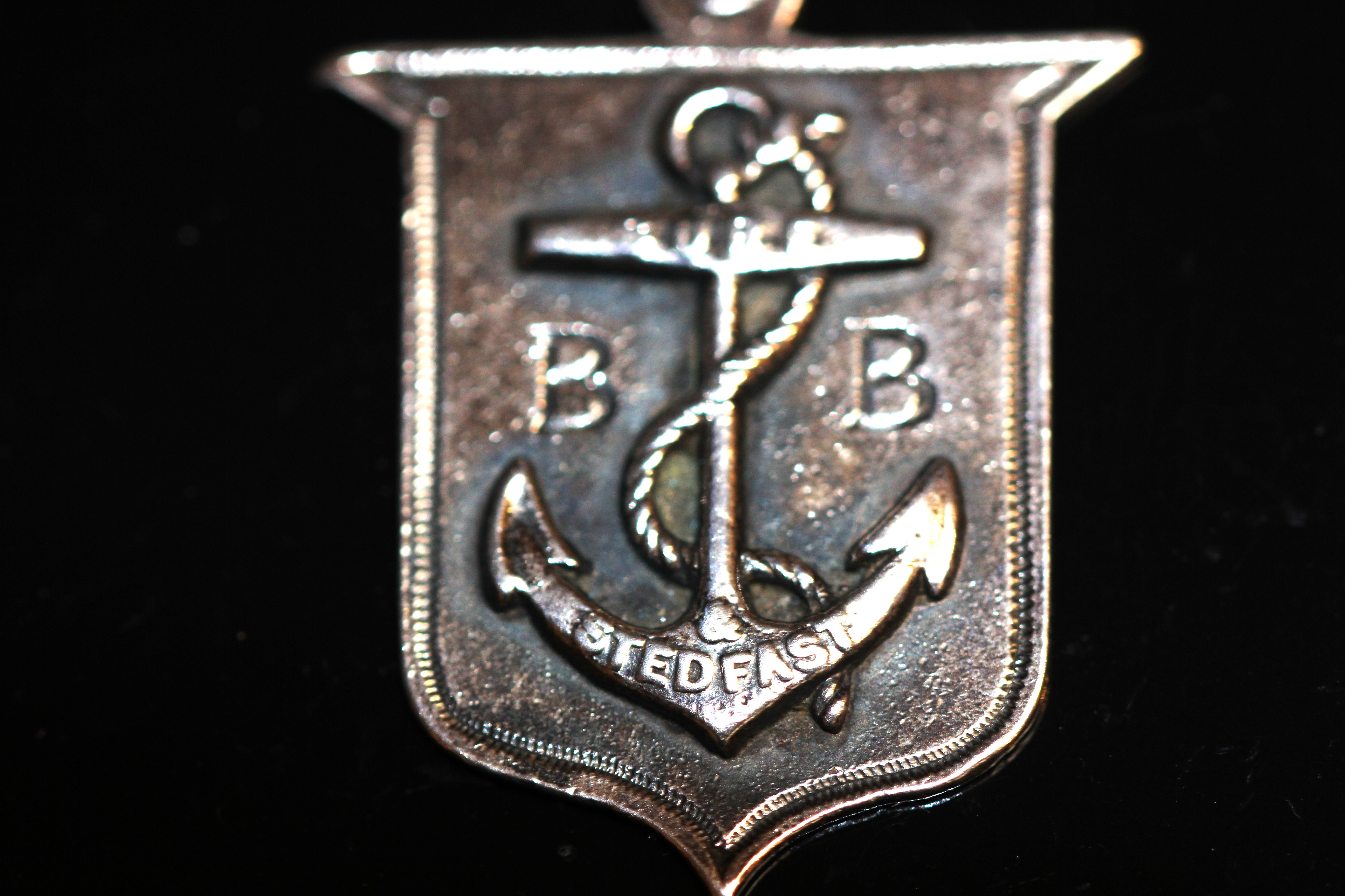 The first medallion is sterling silver, hallmarked JHS, Glasgow, 1897, and is associated with the Boys’ Brigade which was founded in Glasgow by William Alexander Smith in 1883. It was a voluntary uniformed youth organisation with a dual purpose of teaching boys military drill and religion. It was established 20 years before the Boy Scouts. Its membership grew rapidly from its inception, with 206 companies created between 1883 and 1888 and it spread to other countries in the Commonwealth. The Brigade’s badge is an anchor and their motto is ‘Sure and Stedfast’, taken from Hebrew 6:19 in the Bible, “Which hope we have as an anchor of the soul, both sure and stedfast…”. The word ‘steadfast’ replaced ‘stedfast’ later in some countries. This medallion from 1897 is still using the original spelling. There is no inscription on the back of the medallion.