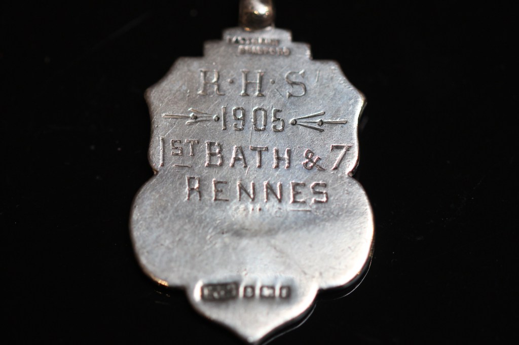 It is the back of the second medallion (top right in the photo at the top of the post) which is the most interesting part. It is hallmarked Fattorini & Sons Ltd, Birmingham, 1905, and is inscribed ‘R.H.S 1905 1st Bath & 7 Rennes’. I have no idea what this means. Usually, these medals are awarded for getting a place in a race or some competition but I haven’t been able to locate what is meant by Bath & Rennes.