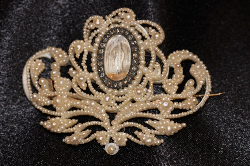 I find mourning jewellery fascinating and have collected quite a few pieces. What interests me a lot is that there is such wide range from large ornate pieces like the magnificent seed pearl brooch at the top of the post to the tiny little Georgian fichu pins, designed to secure triangular pieces of lace or other lightweight material worn around a woman’s shoulders or neckline.