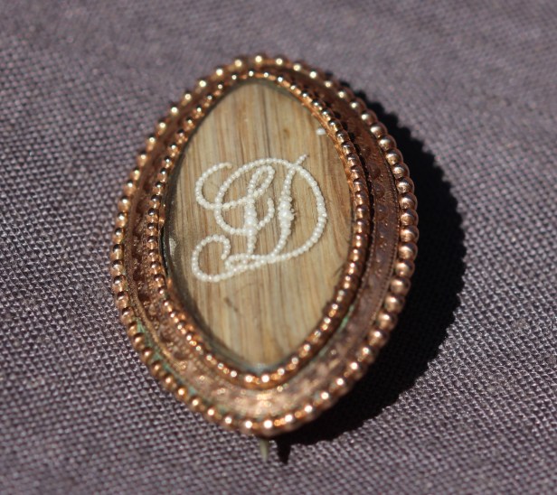 Antique mourning pins and brooches vary a lot in size. As I mentioned last post, there are tiny little Georgian pins, designed to secure triangular pieces of lace called a fichu or other lightweight material worn around a woman’s shoulders or neckline. These pins had to be very light so that they did not tear the delicate material.
