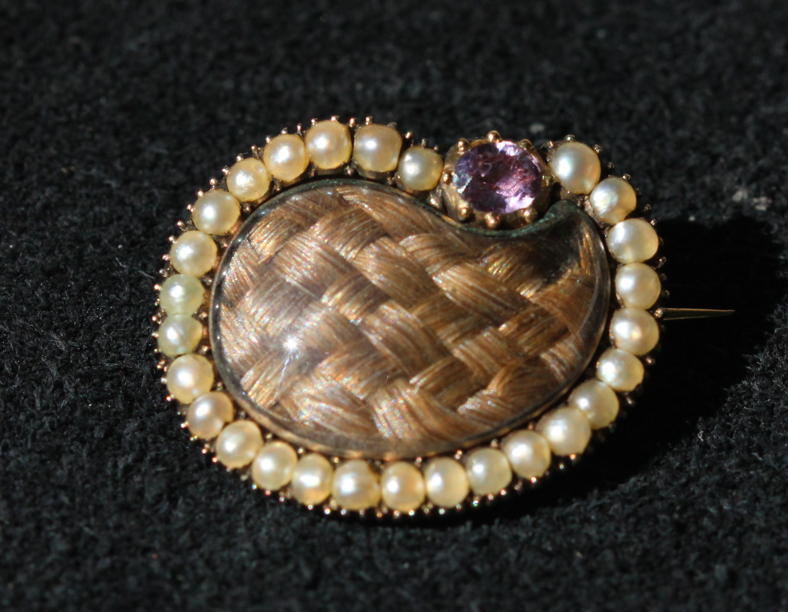 They often had ornate hairwork and tiny seed pearls spelling out initials.The brooch below, shaped like an artist’s palette has beautifully woven hair, bordered with seed pearls and a pink tourmaline.