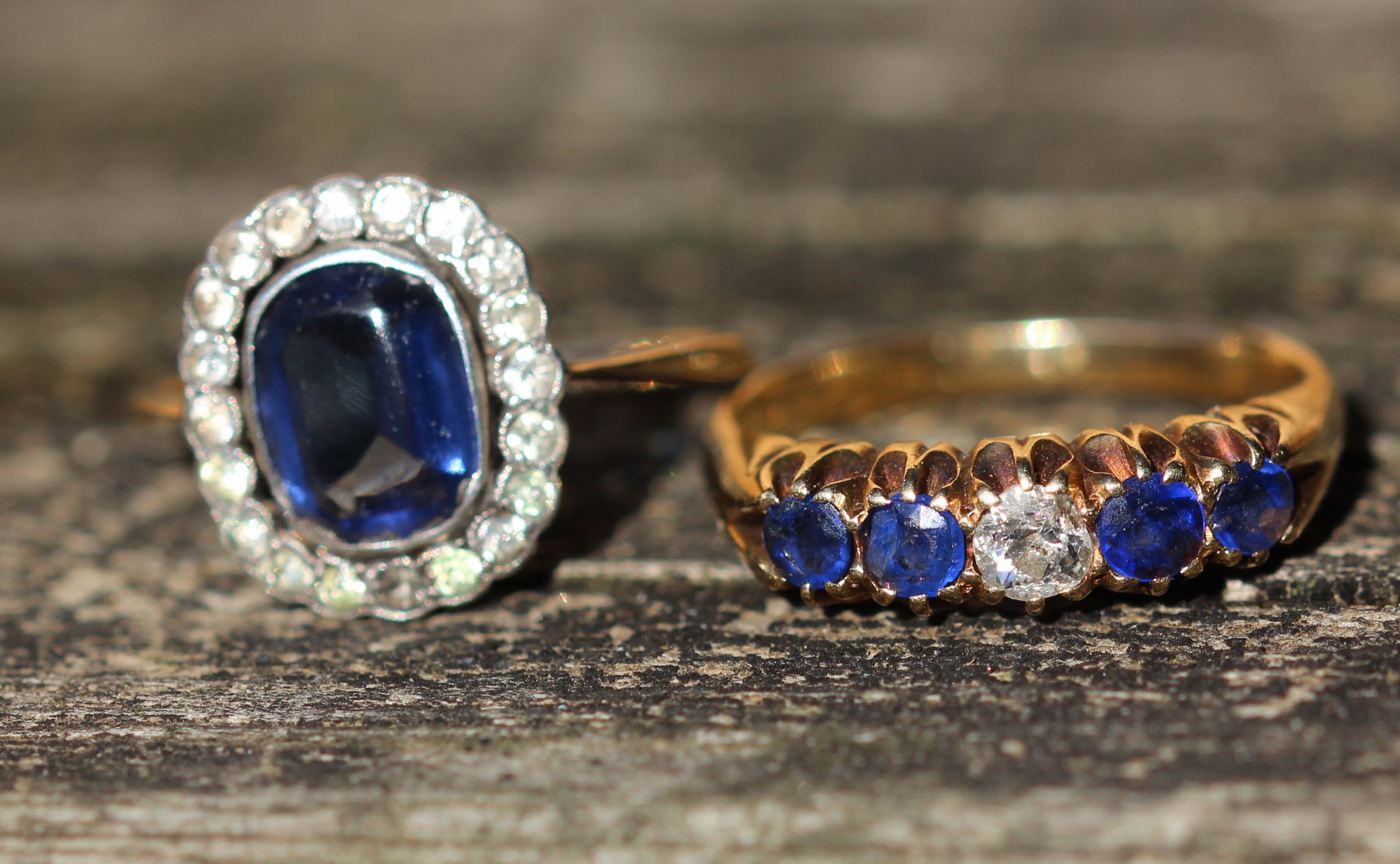 The blue stones in the rings above are glass, unfortunately, although the central stone of the five stone ring is a diamond.