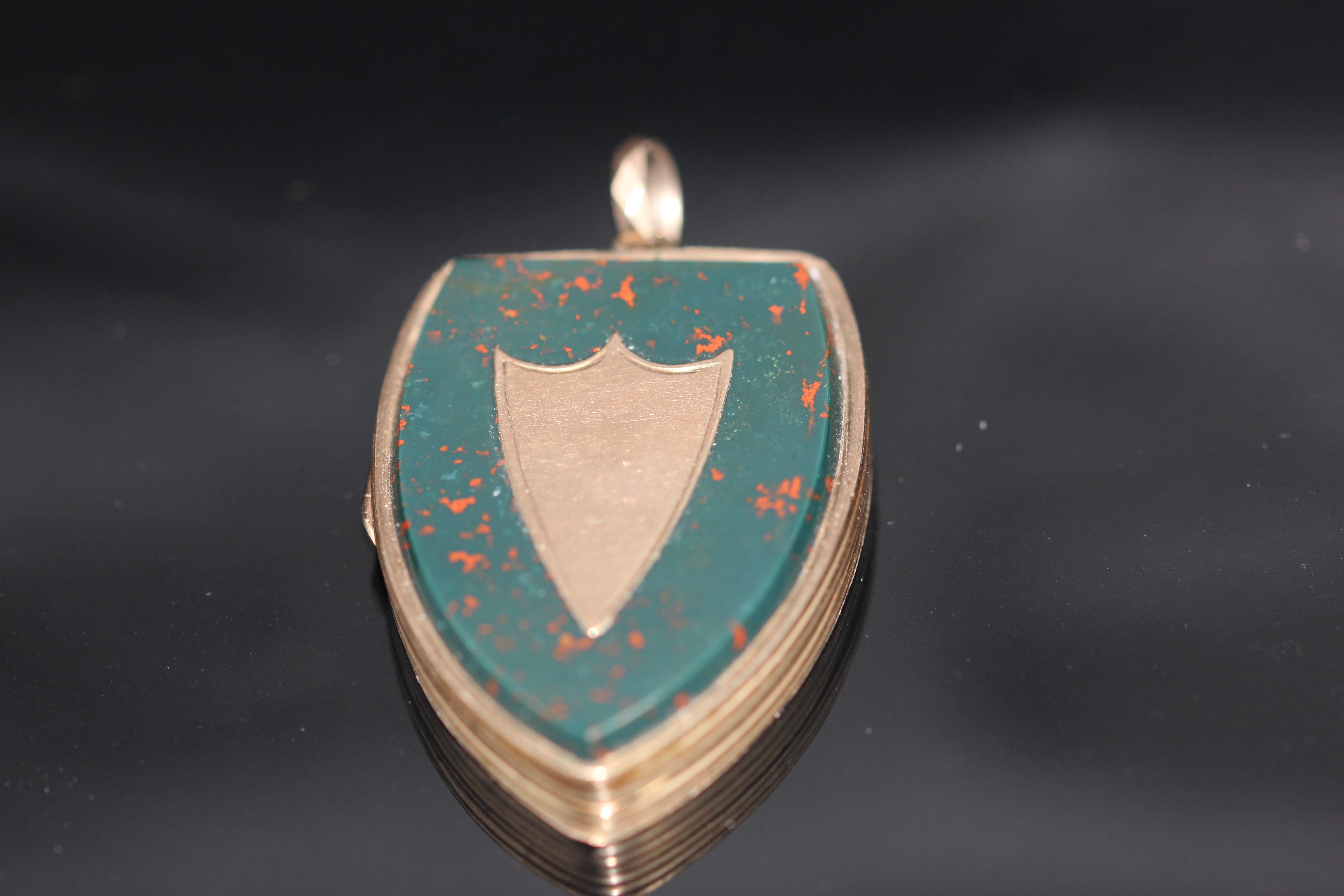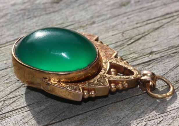The final quartz stone, set into the front of a gold locket, is bloodstone and it falls into the plasma family comprising opaque green to dark green stones. Bloodstone (also known as heliotrope) is green with red spots or streaks. It was used in antiquity for intaglios and this use continued for centuries.