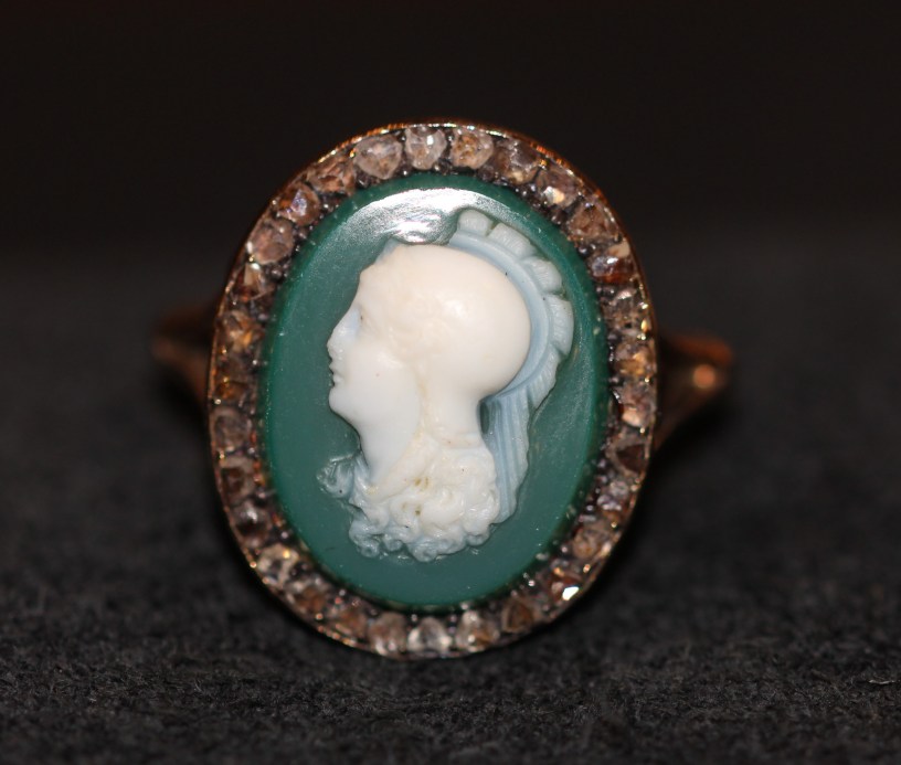 Then we have agate, also from the chalcedony quartz family. The gemstone in the ring at the top of the post shows its two bands of colour, green and white, revealed through the carving of the cameo. The brooch below has moss agate, which has green moss-like inclusions.