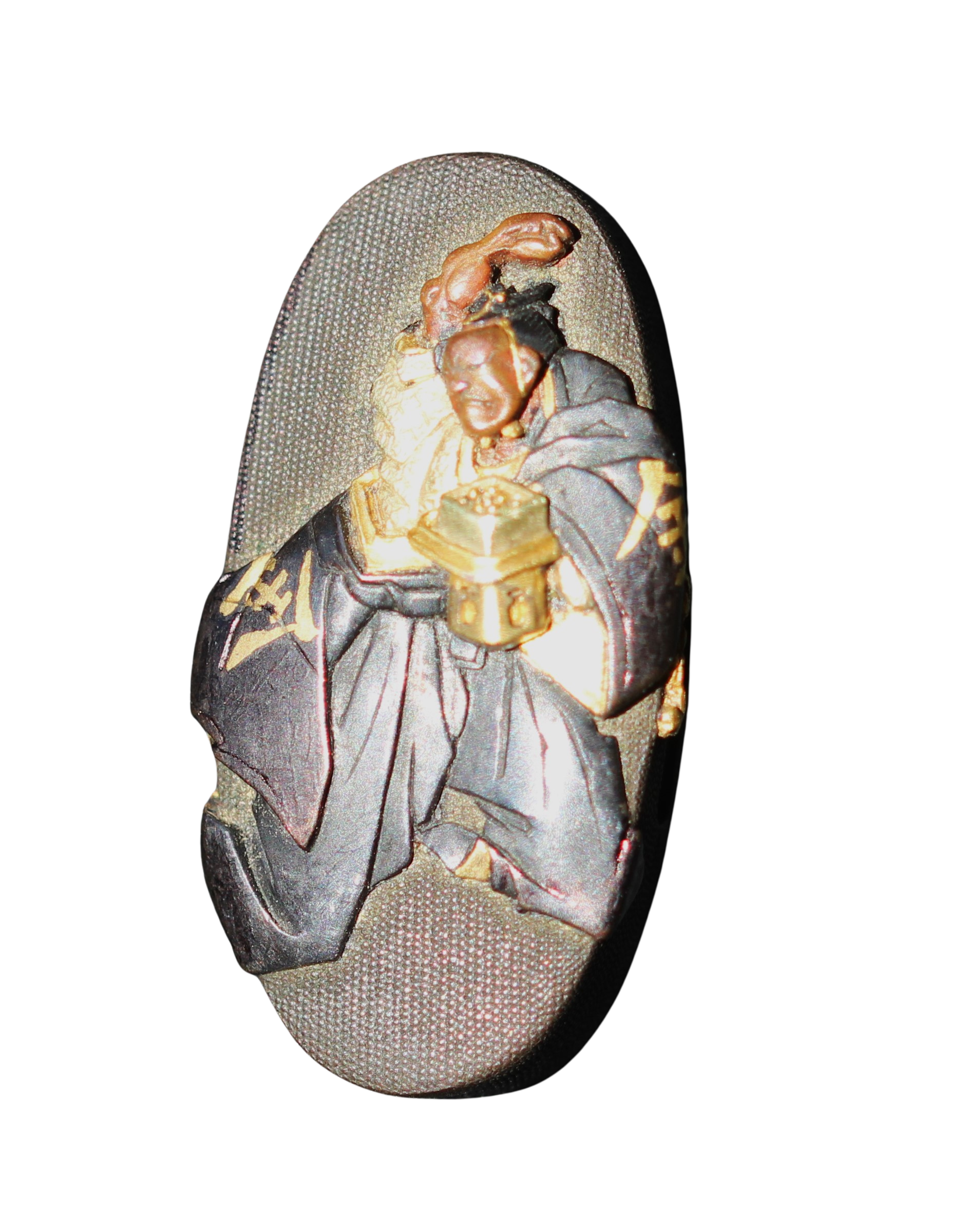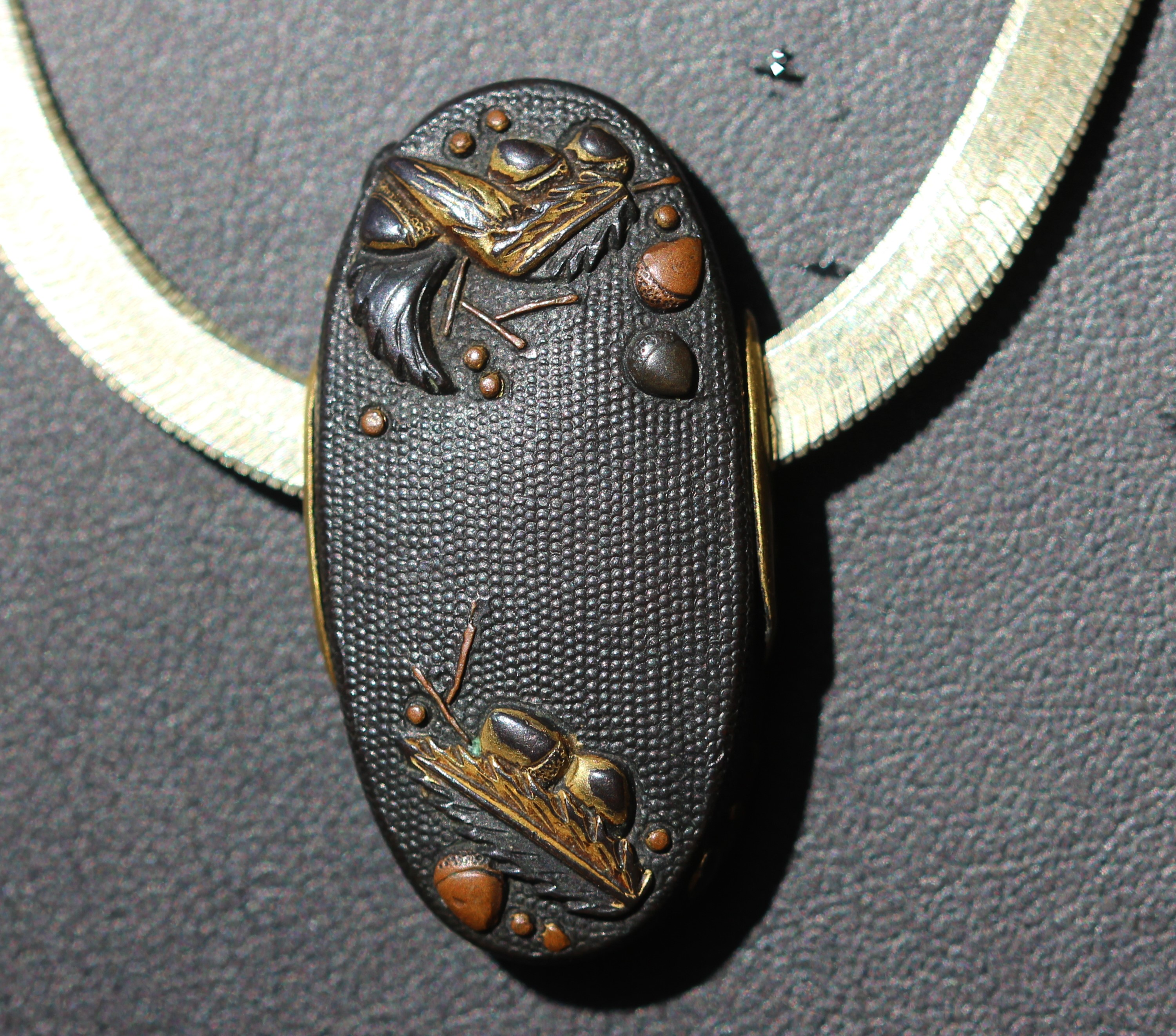 Shakudo was used to create decorations and fittings, known as tosuga, for Japanese swords used by the Samuarai class, particularly tsuba, menuki and kashira. Tsuba was a sword guard, mounted between the sword blade and the grip. They are round with two openings. Menuki were small decorations attached to either side of the sword hilt. Kashira were oval caps at the top of the sword handle. A creative industry of metalworkers was devoted to producing tosuga and other small items, with the peak from the early 17th century to 1876. In 1876 though, an edict abolished the samurai and only military and police officers could wear swords. Many swords had to be discarded or converted to military styles and so the distinctive decorations on them were removed, often to be turned into jewellery.