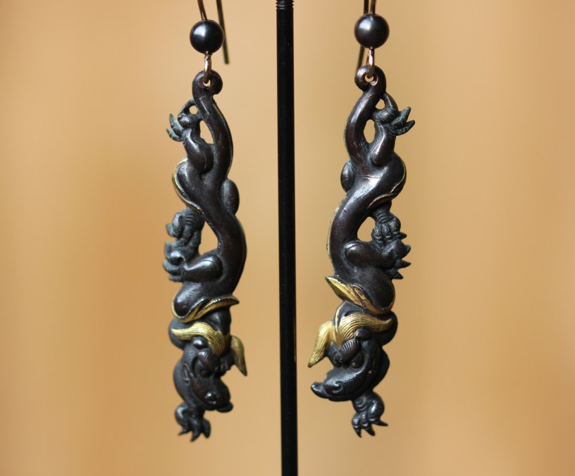 I usually focus on English and European antique jewellery but I recently came across some striking antique Shakudo earrings and wanted to learn more about them. First of all, what does the name ‘shakudo’ mean? Shakudo is an alloy of gold and copper which, when treated, can become black or dark indigo in colour. These Japanese alloys are called irogane,’coloured metals’. This treated alloy contrasts with added gold and silver decorations and those made of other alloys.