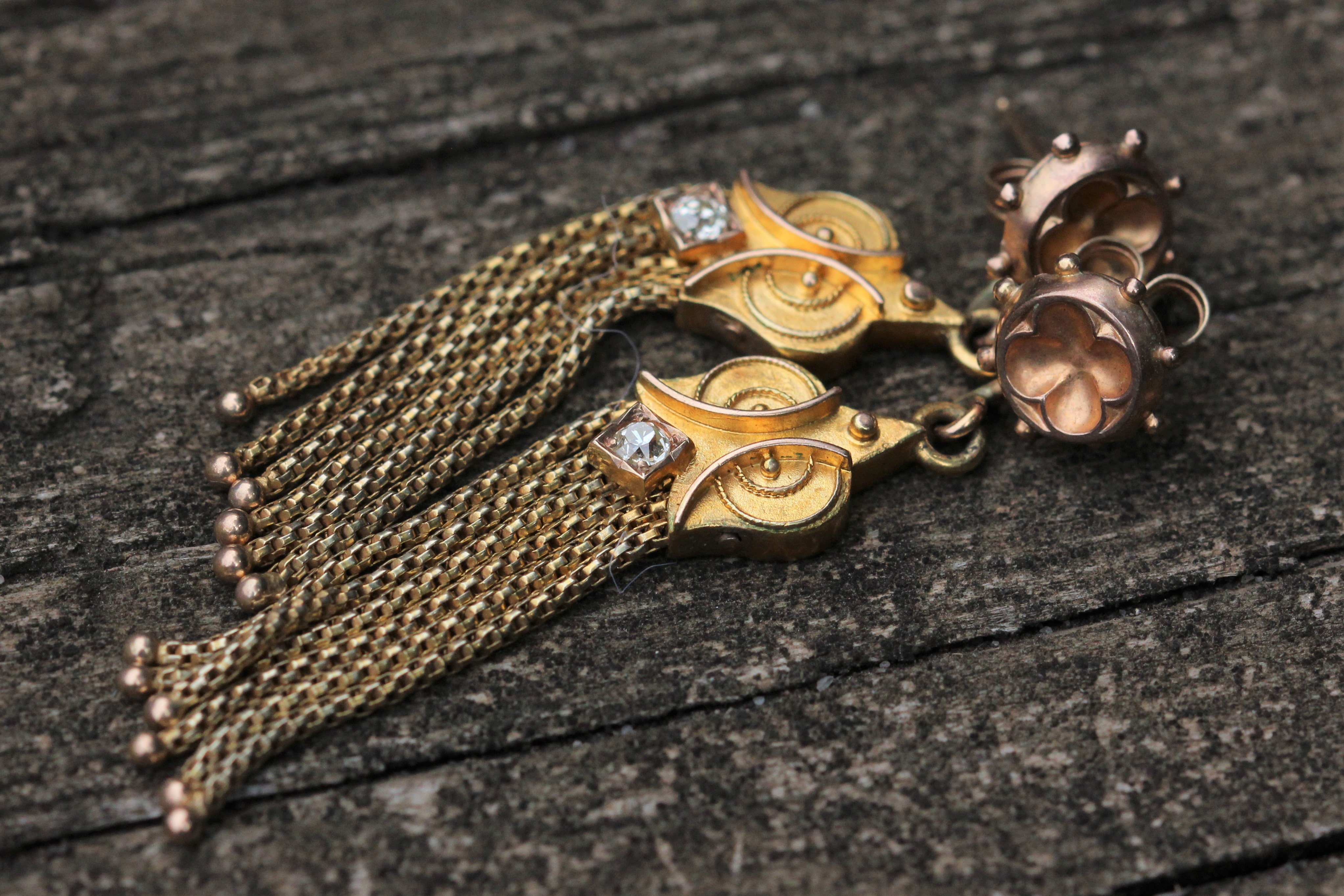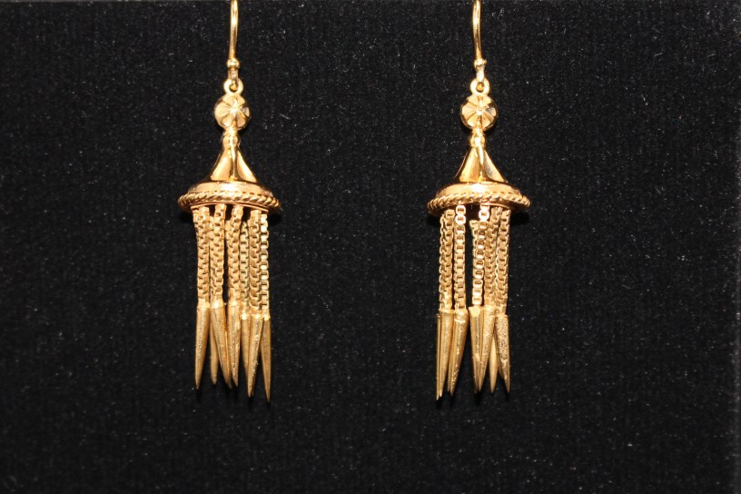 Tassels have been used on jewellery for centuries but they were very popular during the Georgian period when chatelaines were first worn. Later, in the Victorian period, Albert chains for men and the more decorative Albertina chains for women were used to hold watches and fobs and other necessities, with tassels attached. Brooches with tassels spanned the entire 19th century. Earrings, pendant and brooches with fringes were extremely popular in the 1870s in England.