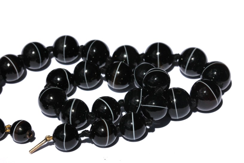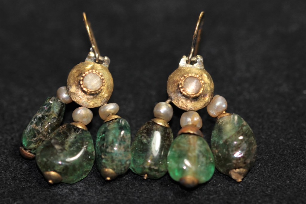 Some of the earliest forms of jewellery were necklaces made of simple round stones with holes drilled into them which were then strung together with leather. Shells and seeds were also used to make simple necklaces. Later, handmade beads were used as well, like the clay faiencé beads of the ancient Egyptians, and then Roman glass beads.