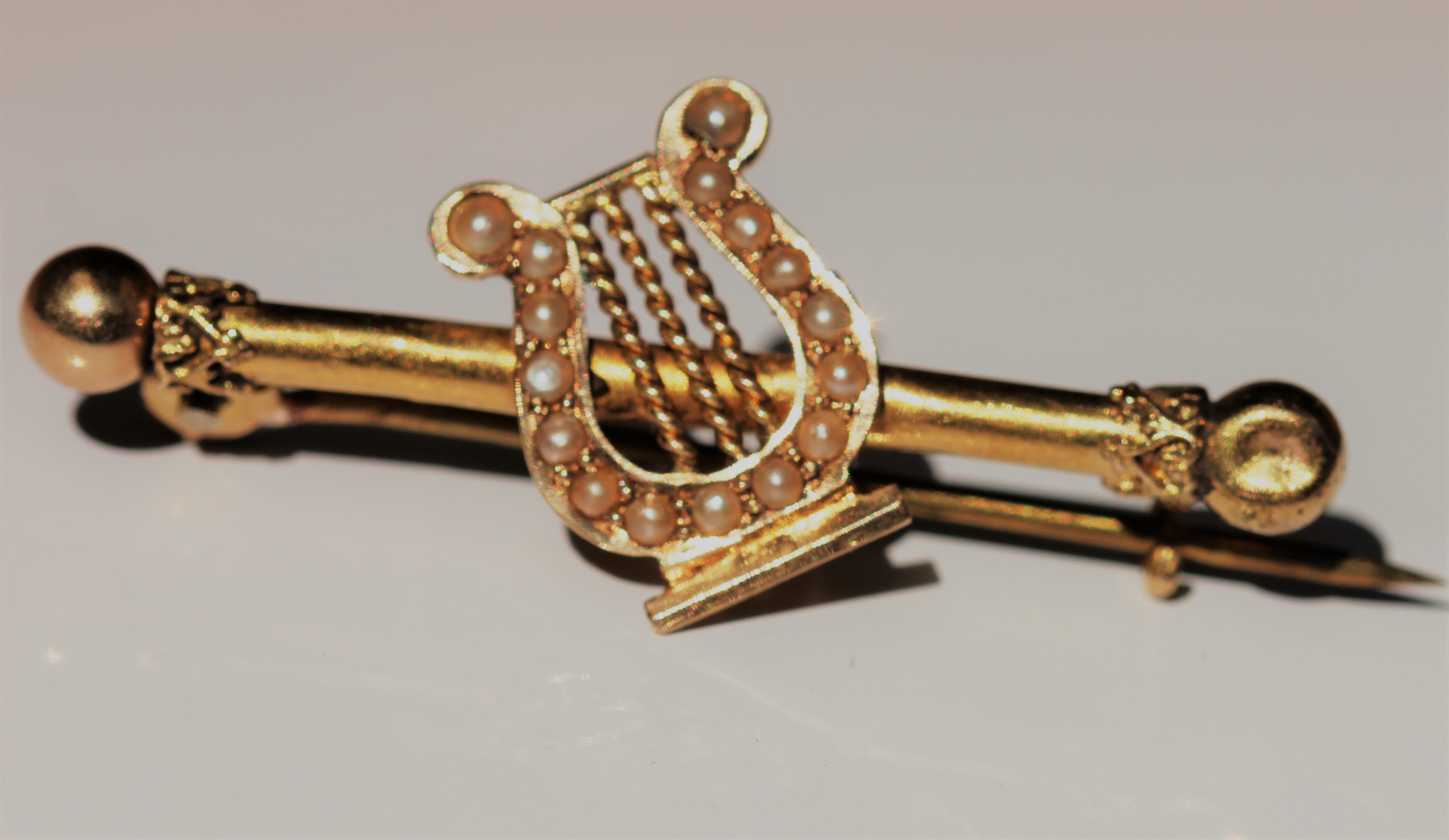 In ‘Understanding Jewellery’, Bennett and Mascetti noted that the simplest form of the bar brooch was a plain gold bar set with a single diamond but that some were ‘decorated with crescents and stars, sprays of leaves and flowers, pheasants and chanticleers, swallows and flies, shamrocks and clovers’ (p230).