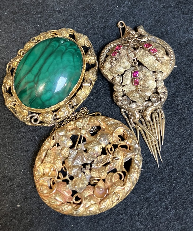 Above is another pendant/brooch, very typical of antique jewellery from the Australian goldfields era, with ornate grape and vine decoration around an oval glazed locket. The central part of the locket is hinged and lifts up to reveal the concealed locket. There is a red paste stone in the centre.