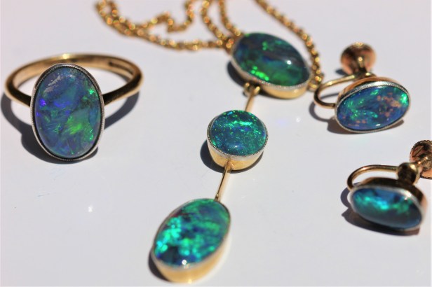 The first recorded discovery of opals in Australia was in 1872 in Queensland. Boulder opals were mined and were used primarily for cameo carving. Opals were discovered at White Cliffs in New South Wales in 1877and commercial production began in 1890 but slowed and declined in the early 1900s. Australian white opals can be found in Australian made and some English made jewellery from the 1890s onwards. It was in 1903 that black opals were commercially mined at Lightning Ridge, also in New South Wales.