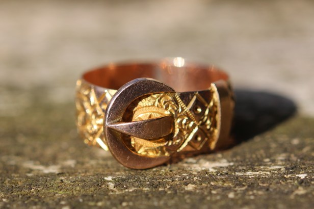 The first wedding anniversary gemstone is gold and I think this buckle ring is a very appropriate present. Buckle rings have been popular since the Victorian period Queen Victoria is said to have popularised the use of the buckle and garter in jewellery. She was the head of the Order of the Garter. Male members of the Order wore a garter, amongst other regalia, around their legs but Queen Victoria began to wear her Order as a form of armlet. This led to bracelets in the form of a garter with a buckle being designed. In turn, rings in the form of a belt and buckle were produced. The Order of the Garter was supposed to symbolise the qualities of loyalty, fidelity, and protection and so led to the creating of very symbolic jewellery. Very romantic.