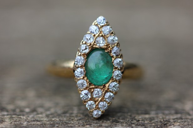 For the 20th wedding anniversary, emeralds are the gemstones. I think this late Victorian marquis shaped ring with a central oval emerald and a diamond border comprised of 20 old brilliant cut diamonds and four rose cut diamonds would be a perfect gift.