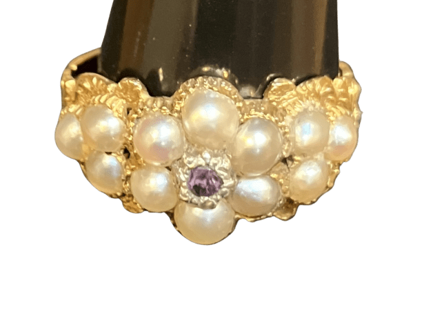 The 30th wedding anniversary gemstone is the pearl and there are some many types and designs of pearl jewellery that could be given. Here is a lovely Edwardian split pearl ring set in an ornate gold setting with a central amethyst.