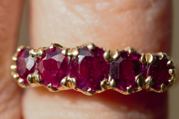 Forty years of marriage is a long time together so a special piece of jewellery is required. The ruby is the gemstone for this decade and I have selected the ring below, an antique 18ct five stone ruby ring with tiny diamonds. The colour is intense.