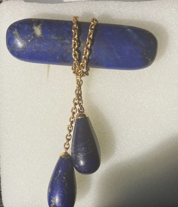 The fittings of a piece of jewellery can assist with identifying age. In the case of this striking lapis lazuli brooch, below, with hanging 18ct gold chains, it is the brooch fitting which is useful. It is a C-clasp and pin from the 19th century.
