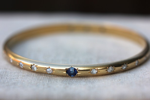 The next two photos are of a vintage gold bangle with an interesting setting of gems. The front of the bangle has 10 mixed cut diamonds with a lovely central sapphire.