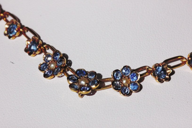 Let’s look at some sapphire set jewellery. The photo at the top of the post is of an antique 15ct gold necklace with with eleven sapphire and pearl flower links. Quite a delicate piece .The Victorian gold ring above is a double headed snake ring, with sapphire crests and tiny diamond eyes.