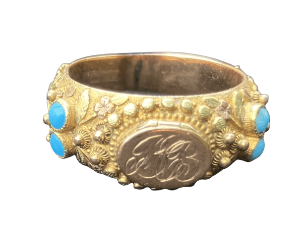Glass has been used to imitate turquoise, pearls, opals, diamonds, rubies, emeralds, rubies – so many. One interesting glass from the late 18th century to the late 19th century is opaline glass. Used for bottles, vases and boxes, it was also used in jewellery. The glass is an opaque to semi opaque stone originally made from adding bone ash to lead crystal. This resulted in a milky white semi opaque glass with flashes of colour like an opal, leading to its name. Other early colours were turquoise blue, yellow and pink. Despite its name, opaline was used as a substitute for other gemstones including turquoise. The Georgian gold locket ring pictured below contains two blue cabochon opaline set into each ring shoulder.