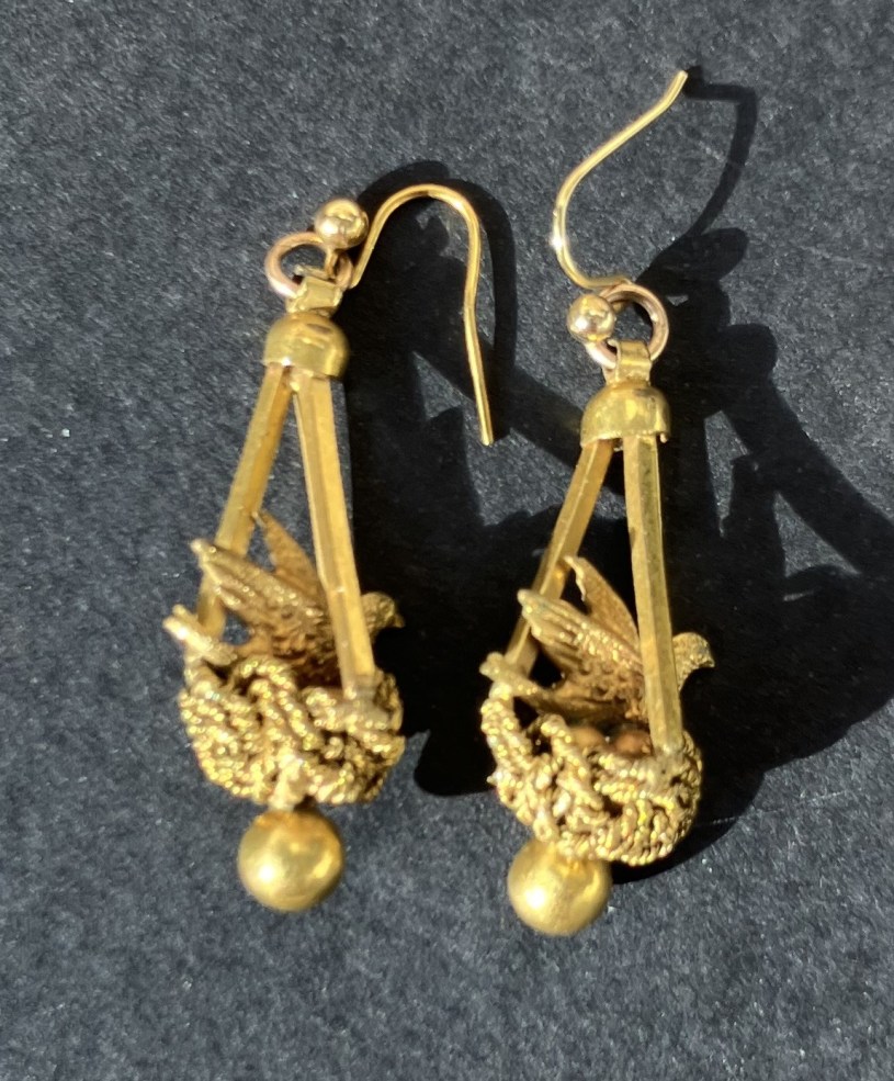 Earrings and brooches with birds in flight or just sitting on their nests like those in the photo at the top of the post were common. Earrings and pendants shaped as baskets were made, filled with different items. The little dangling metal basket earrings below, carrying little sticks of coral, are a good example.
