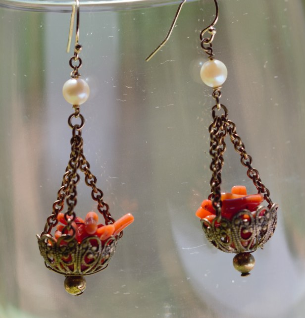 Earrings and brooches with birds in flight or just sitting on their nests like those in the photo at the top of the post were common. Earrings and pendants shaped as baskets were made, filled with different items. The little dangling metal basket earrings below, carrying little sticks of coral, are a good example.