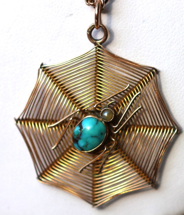 The pendant below is similar, except the cobweb is gold and the spider in the centre has a pearl set head and a turquoise set body.
