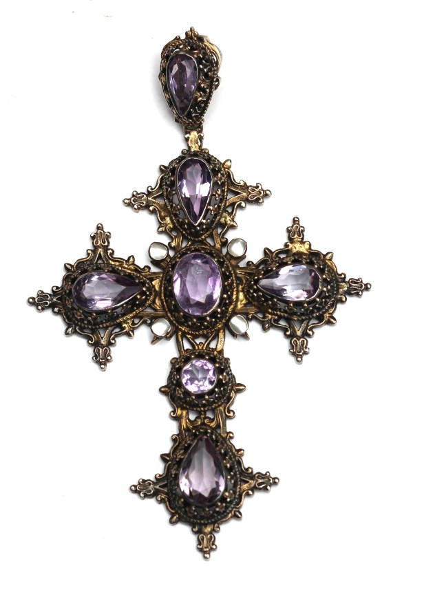 Another 19th century jewellery revival was the Gothic revival, in which jewellers were inspired by Gothic architecture, with its pointed arches, ribbed vaults, and flying buttresses, as well as excessive ornamentation. Crosses and religious motifs were also featured. This large amethyst cross is a good example.