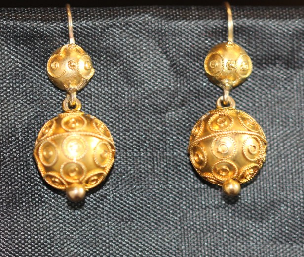 Then there were the excavations of Etruscan graves in the 19th century. The Etruscans lived on the western coast of Italy, now Tuscany, from approximately 700 – 300 BC. Their culture was based largely on the Greek culture but they in turn influenced the Romans who eventually defeated them in the 4th and 3rd centuries BC. During the Early Etruscan Period (7th century BC to the 5th century BC), they developed their own unique metal working techniques, which included granulation, tiny gold beads, and thin twisted wires densely applied to the surface. Wealthy Etruscans were buried in massive tombs, some entirely underground, accompanied by their jewellery and other possessions. While some grave excavations occurred during the Renaissance and in the eighteenth century, it was in the mid nineteenth century that major archaeological sites were established in Tarquinia, Cerveteri, and Vulci.