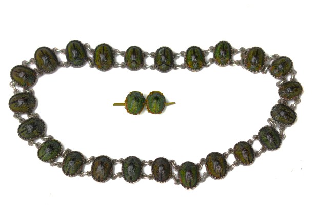 The excavations in Egypt by Europeans which first began with Napoleon’s invasion of Egypt in 1798 in was to lead to discoveries of jewellery, amongst other treasures. One particular Egyptian motif which caught the attention of Victorian was the scarab beetle, and many versions of jewellery containing actual beetles were produced. Dried iridescent green beetles were imported from South America from around 1869 onwards and were incorporated into imitations of ancient Egyptian amulets and pendants containing scarabs. Using real beetles also satisfied the Victorians’ interest in natural history.