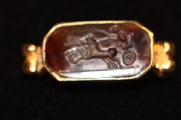 Carved pieces of jewellery have been created for thousands of years. The earliest forms of carved stones were probably designs carved into soft stones like sandstone and soapstone, fired clay or into man-made ceramic faience (comprised of quartz, alkaline salts, lime, and mineral-based colouring agents). The Egyptians used these engraved stones as seals, with the top being in the shape of a scarab and the bottom engraved with hieroglyphic characters. Rings holding gemstones with the engraving on the top came in in the Hellenistic period (from 323BC to around 40BC) and these finger rings were adopted to hold personal seals (Gray, 195). The Romans also wore rings that were not necessarily personal seals, with gems engraved with images of gods and goddesses, political leaders and sports stars. Metal rings (gold, silver, bronze) began to be used for seals around this time