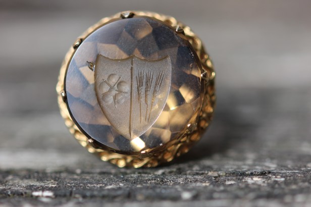 Intaglios from the 18th and 19th centuries appear to be personal seals, with coats of arms, mottos, etc. The ring above has a shield with three wheat stalks on one side and a flower on the other. The wheat ears means faithful while the flower is a cinquefoil (a five petal or lobed flower) which means hope and joy. The carnelian intaglio in the photo at the top of the post features a bird on a branch with three symbols above its head.