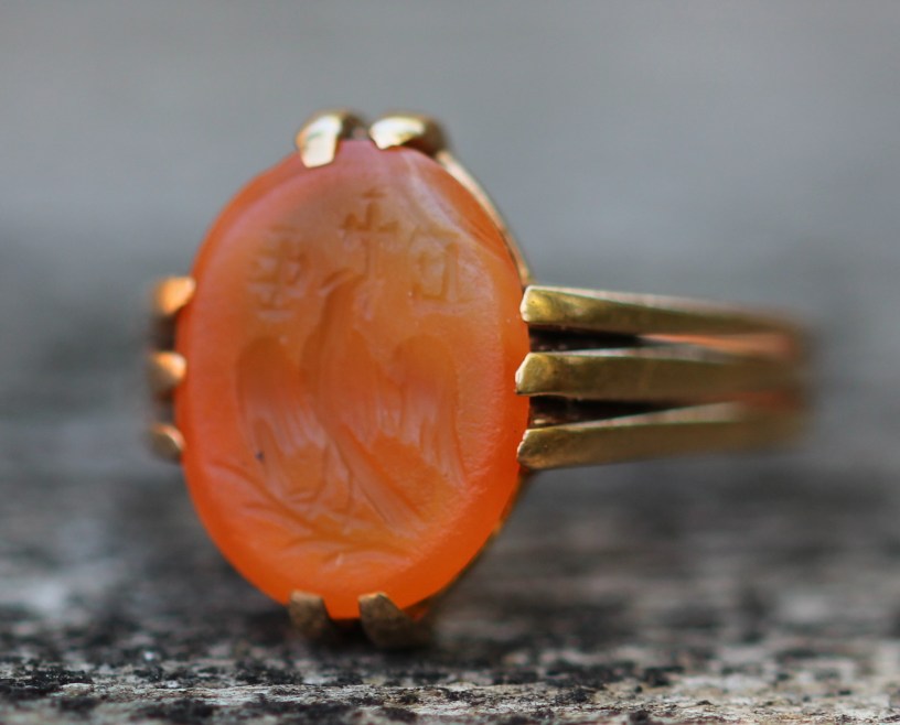 Intaglios from the 18th and 19th centuries appear to be personal seals, with coats of arms, mottos, etc. The ring above has a shield with three wheat stalks on one side and a flower on the other. The wheat ears means faithful while the flower is a cinquefoil (a five petal or lobed flower) which means hope and joy. The carnelian intaglio in the photo at the top of the post features a bird on a branch with three symbols above its head.