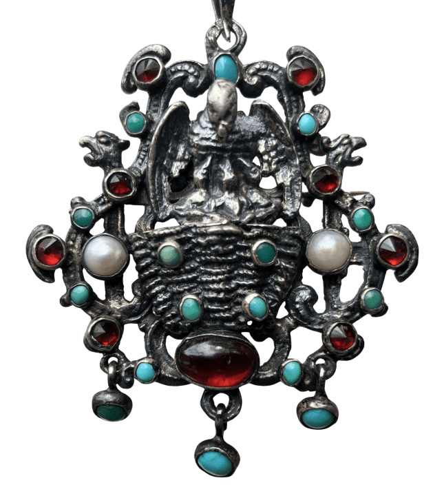 The antique brooch/pendant below is French and is silver, set with turquoise, garnets and mother of pearl. It features a pelican and is apparently meant to represent a passage about sacrifice found in a poem La Nuit de Mal by Alfred de Musset.