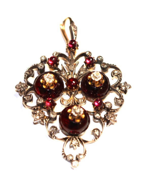 The next piece is a Victorian gold and silver pendant set with dark red garnet cabochons and old cut diamonds.