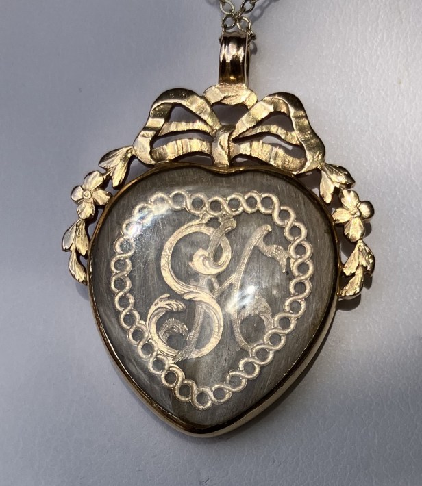 The piece below is a 19th century 18ct two sided locket shaped like a heart and topped with a gold bow and flower wreath. Each side contains hair, one a lighter shade than the other and there are different sets of gold initials on each side, so representing two people.