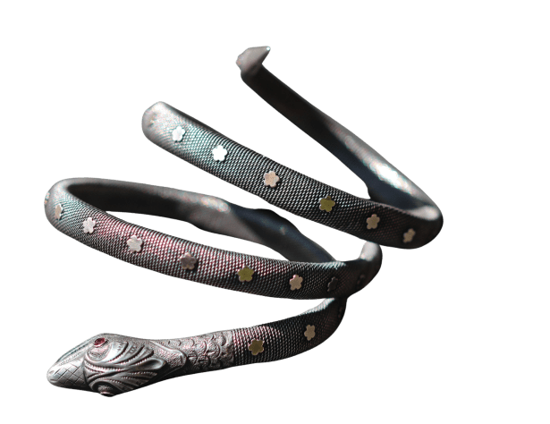 One of my favourite jewellery books is ‘Serpentina’ by Fritz Falk. In it, Falk traces the history of snake jewellery in Europe and Asia from the Ancient Egyptian period to the 20th century. He also explores how snake jewellery appeared in West Asia countries, Africa and the Americas over time. The jewellery photos are splendid and capture the essence of snakes, long, slithery and able to be wrapped around wrists or necks, or coiled around fingers.