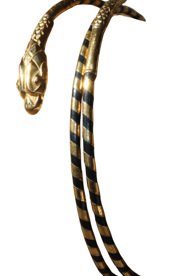 The final snake bracelet is 19th century French, made of pinchbeck and black enamel. With engraved pinchbeck head and tail. It is more rigid than the other snake bangles but does encircle the wrist two and a half times.