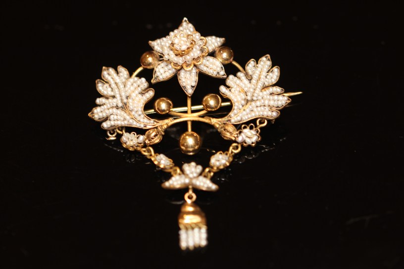 Seed pearls have been used for jewellery for a long time. A seed pearl is defined as a small round or nearly round pearl which is generally less than 2mm in diameter. Seed pearl jewellery was particularly popular in the 19th century but was also found in the 18th and early 20th centuries.. The work required to produce it was delicate and time-consuming but resulted in quite beautiful pieces.