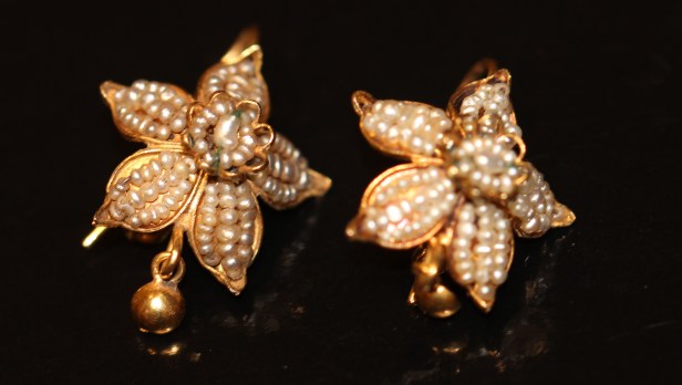 There are different types of seed pearl jewellery made during this period. One type is illustrated in the photo of a brooch at the top of the post and the earrings below. The flower gold brooch is set in gold while the seed pearls have been threaded on thin gold threads. The floral earrings, which were bought separately but which look as if they belong with the brooch, have been constructed in the same way. They are typical of Georgian Spanish or Italian construction.