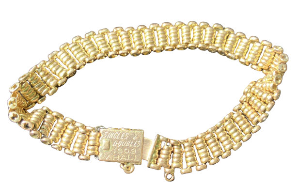 The bracelet above is an Edwardian era gatelink bracelet. Gatelink bracelets are comprised of panels of vertical bars wrapped with horizontal bands of gold. This one has an inscription indicating it was a prize for V Hall being successful in singles and doubles games, presumably tennis, in 1909.
