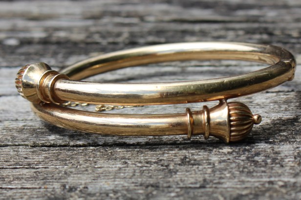 The next bangle is an antique Etruscan revival bangle with a hinged back and a cross over front ending in gold decorated balls.