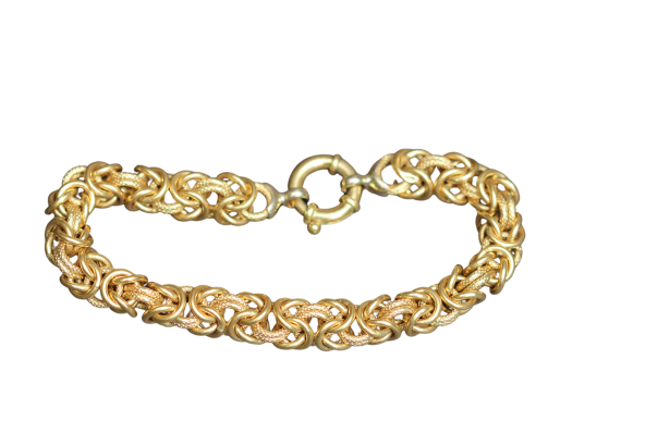 The final gold bracelet is a vintage one. It is comprised of a clasp and a byzantine chain, a fairly complex arrangement of 4 links, each of which passes through another link. Two of the links are engraved while the other two are plain.