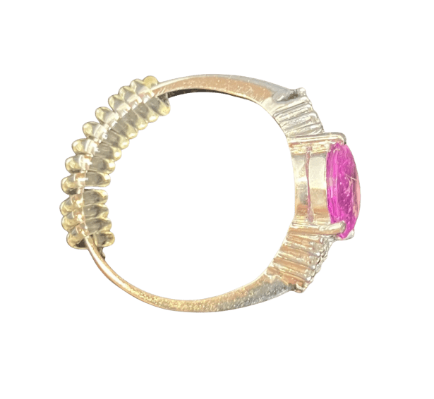 The next gadgets are ring adjusters used to reduce the size of the ring if you don’t want to have the ring permanently altered. One is a metal adjuster, a flat bar with bent prongs. It is fitted over the base of the ring and then the prongs are bent around the band. They come in different sizes and can be found in gold and other metals. You can see one attached to the ring below.