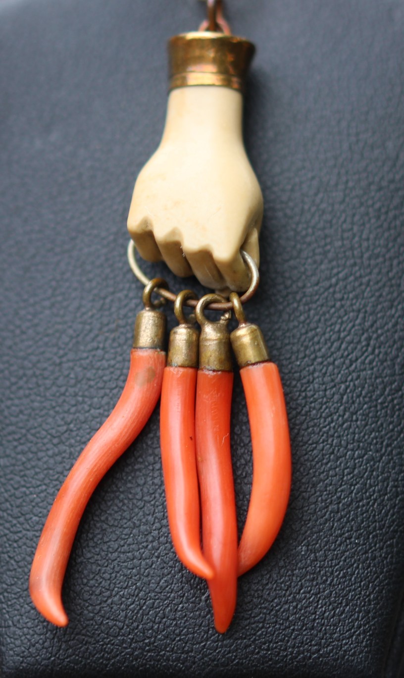 Traditionally, single hands were also used as amulets. The hamsa, which is an open hand, palm forward, dates from early Mesopotania, and is a protection against evil. Another version of a hand amulet is the figa, with the thumb of the hand protruding through a clenched fist. It has been held to promote fertility, due to it representing female genitalia, as a gesture of contempt, and as a protection against evil.