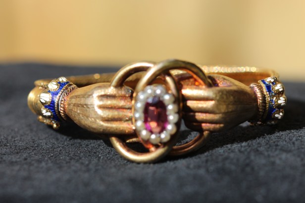 Clasped hands and single hands are a motif seen in antique jewellery over a very long time. The motif of hands has been used in jewellery for a long time. Jewellery with hands has been found from the Phoenic1an, Egyptian, Roman and the early Celtic periods and they were found again in the late Middle Ages and Renaissance and into the Georgian and Victorian eras.